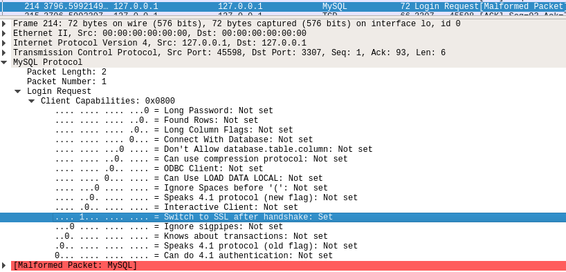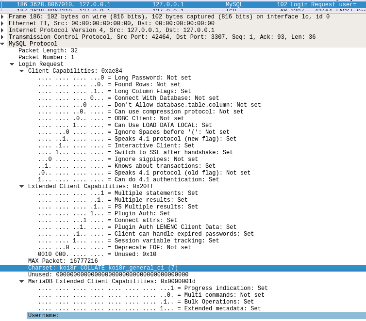 As I showed there, MariaDB clients including Connector/C send a great deal of identifying information about themselves in plaintext in the initial "login request" packet, even when they subsequently switch to TLS, and then resend a login request packet over the TLS channel: