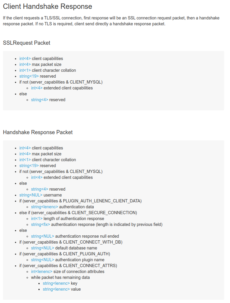 This information includes the client capability bits, the client's MAX_ALLOWED_PACKET size, and the client's charset.