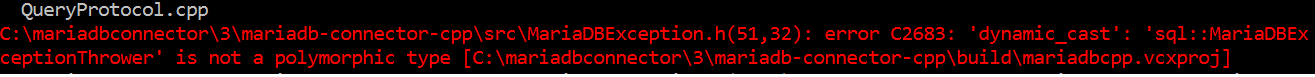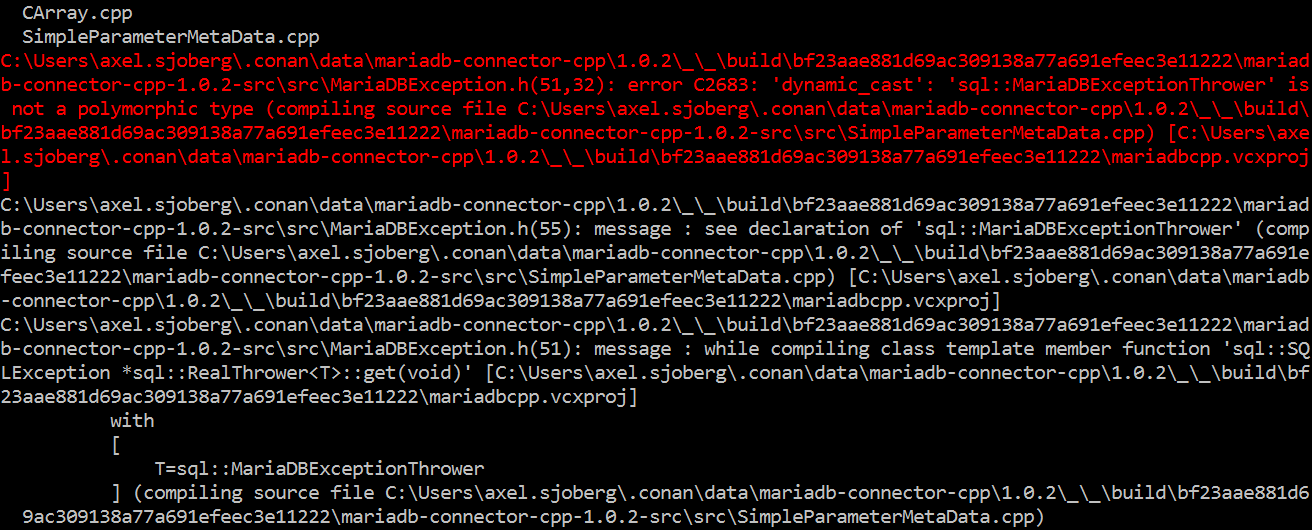 I'm in the progress of transition from Visual Studio 2017 to 2022. When trying to compile the c++ connector, I get the error shown in the attachments. I have created Conan package manager recipes for the connector and I provided them too, including my conan profile file. Compiling with or without Conan, I still end up having the compilation abort with the same dynamic_cast error. I have also tried to build with MSBuild and Ninja. I have exhausted my ideas about how to fix this.