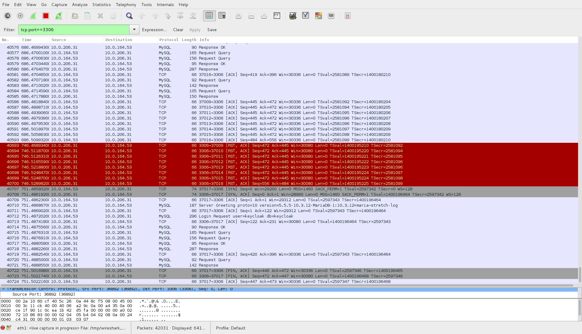 After wait_timeout expires, server sends TCP RST to all TCP connections. Then JDBC tries to create another TCP connection, which seems successful, but for some reason JDBC closes this new TCP connection immediately.