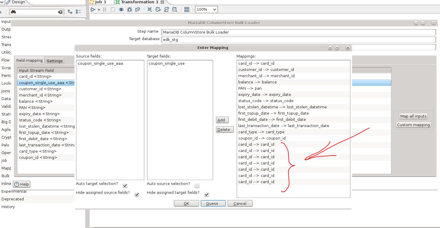 Open MariaDB Bulk Loader module > Field mapping tab > Custom mapping button window > Guess button