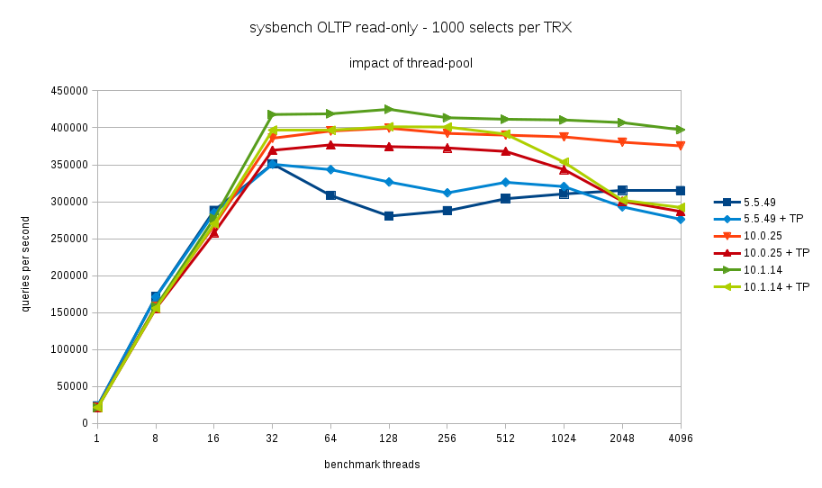 The benchmark is sysbench OLTP read-only with 1000 point-selects per transaction. The benchmark machine has 16 cores (32 hyperthreads).