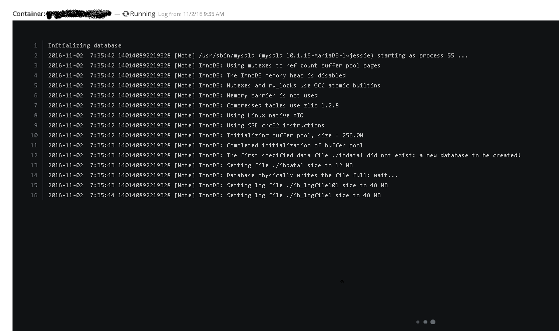 2016-11-02 6:40:46 140203338909632 [Note] /usr/sbin/mysqld (mysqld 10.1.16-MariaDB-1~jessie) starting as process 60 ...