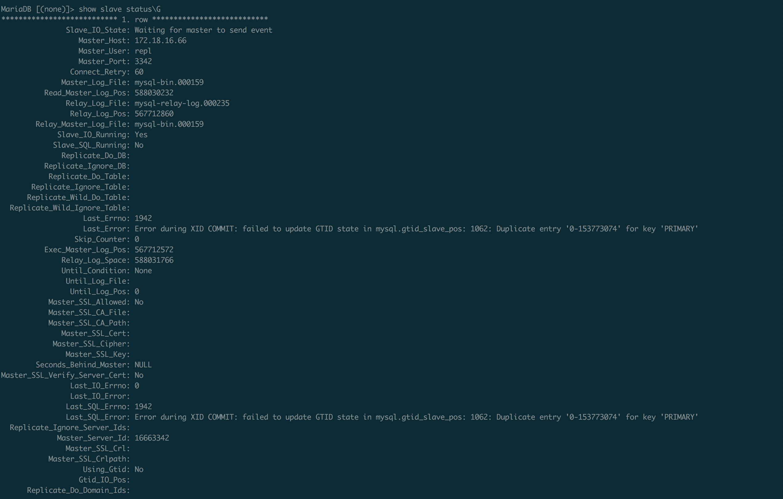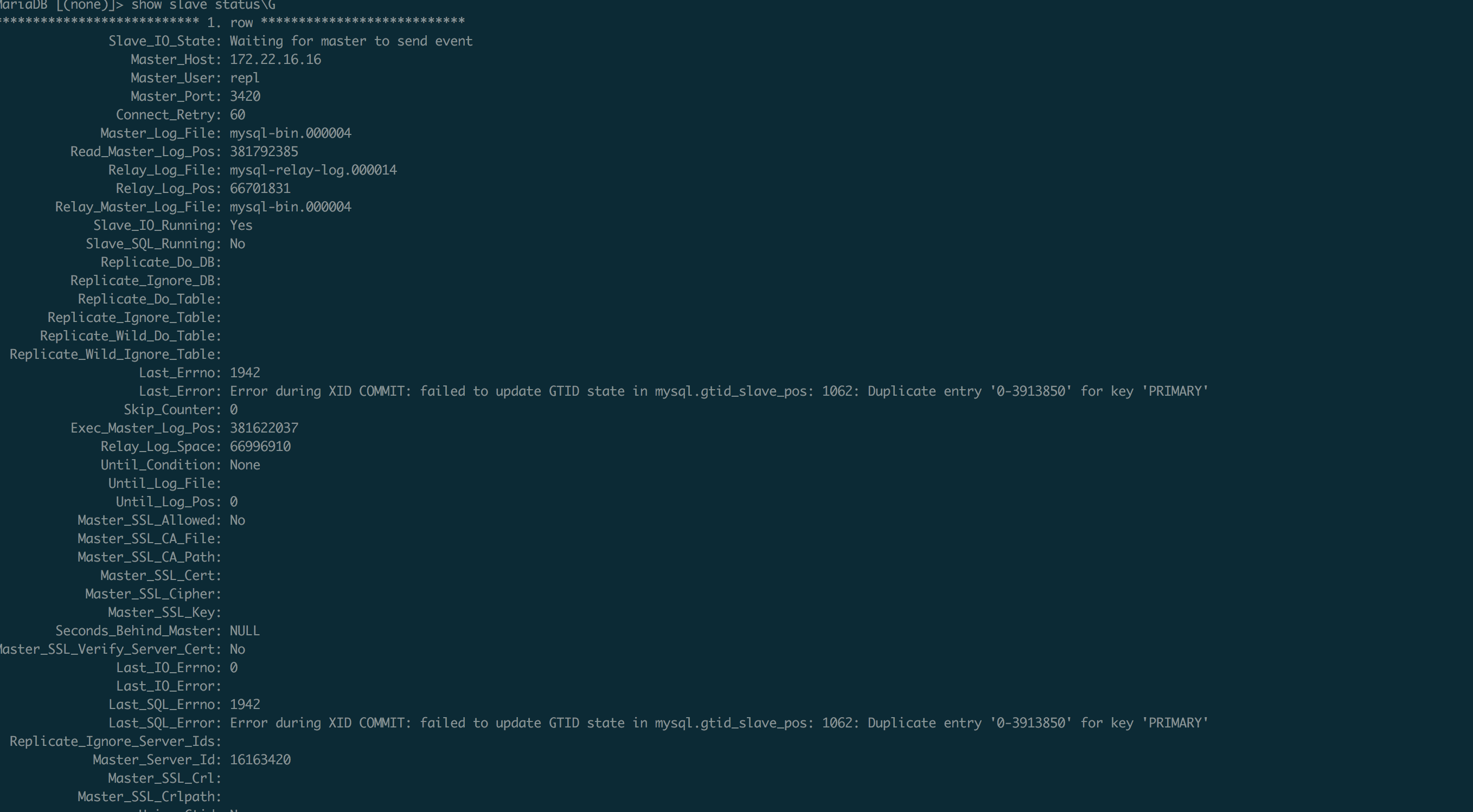 Last_Error: Error during XID COMMIT: failed to update GTID state in mysql.gtid_slave_pos: 1062: Duplicate entry '0-3913850' for key 'PRIMARY'