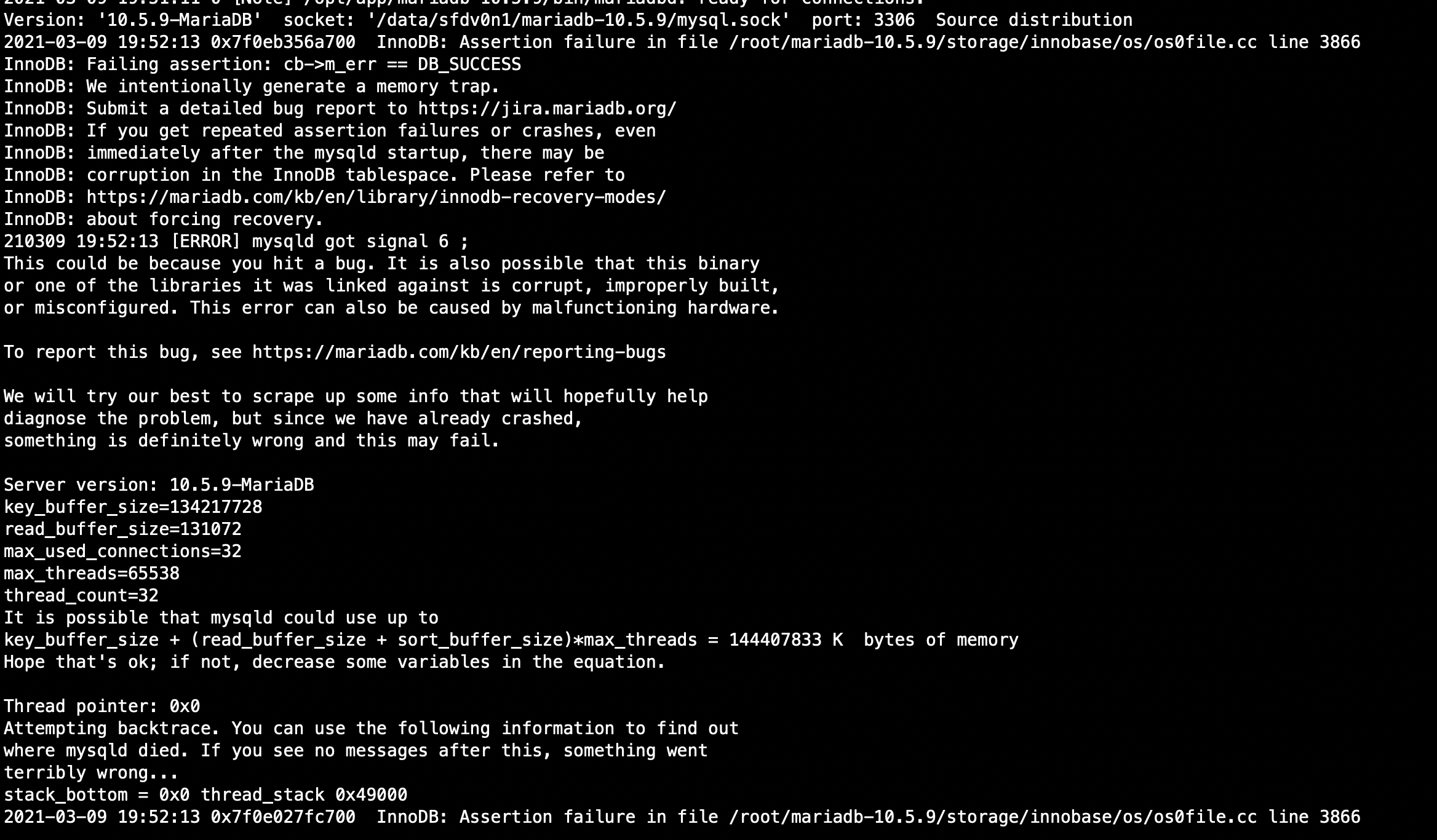 5. After a minute or so, the sysbench tells you that the connection is broken. If you look at the MariaDB error log, you can see a crash prompt similar to the one shown in the figure below
