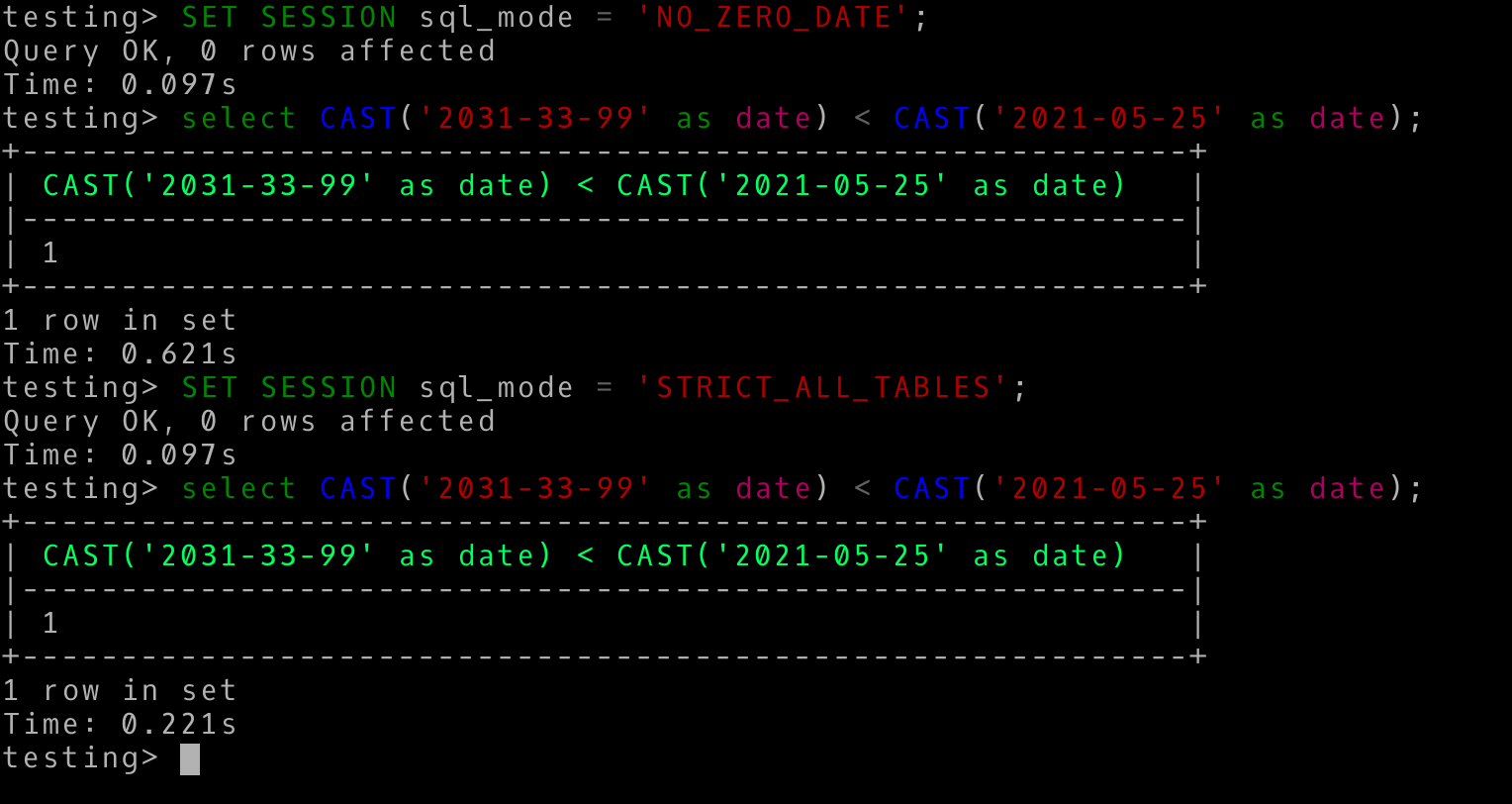 testing> SELECT CAST('2031-33-99' as date), CAST('2021-05-25' as date), CAST('2031-33-99' as date) < CAST('2021-05-25' as date), CAST(null as date) < CAST('2021-05-25' as date), null < CAST('2021-05-25' as date)\G