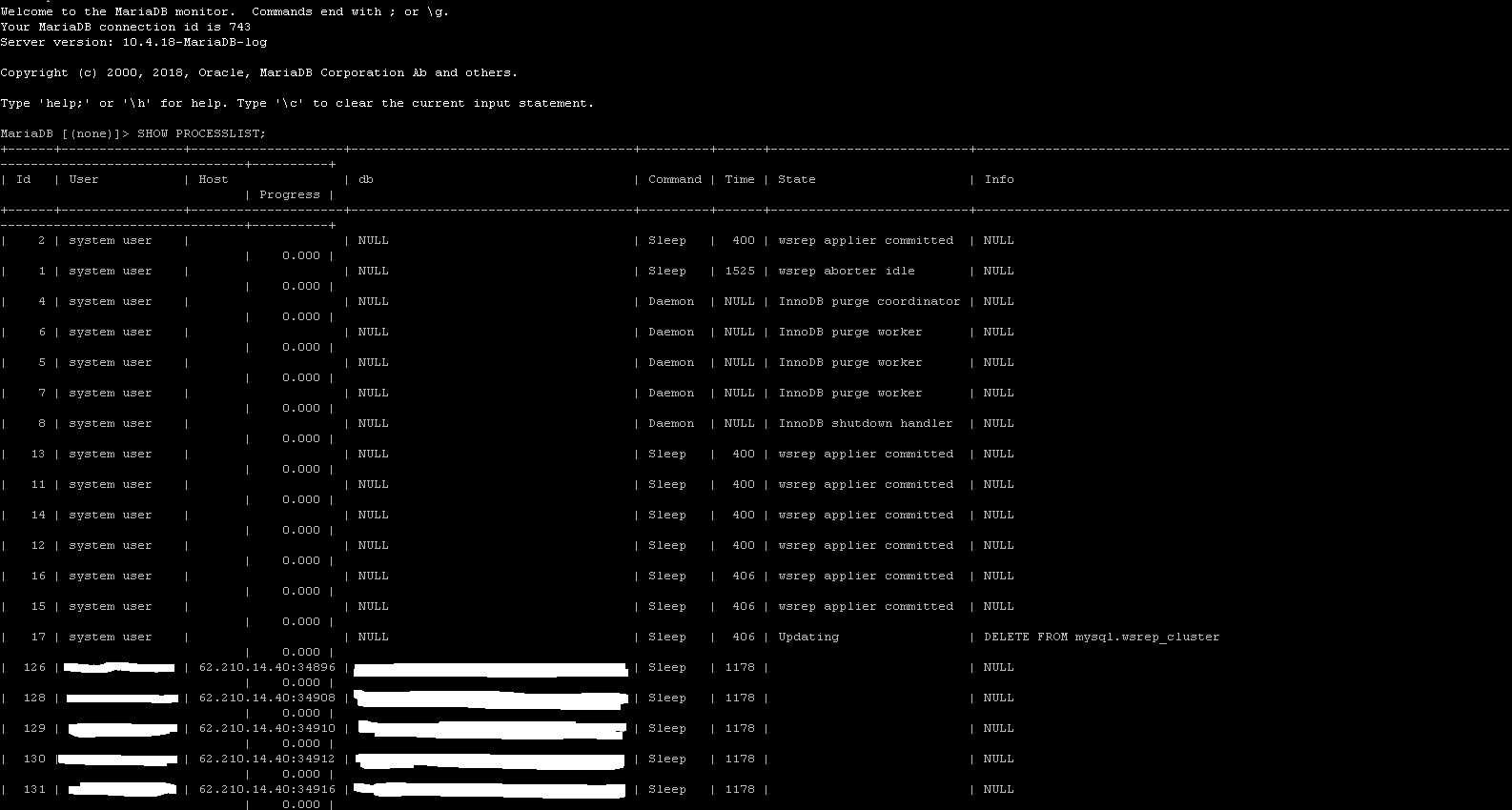 3 The other 2 nodes are accessible via mysql connection with root account but when I check the process list in MariaDB I have always the following query hanged updating: DELETE FROM mysql.wsrep_cluster.