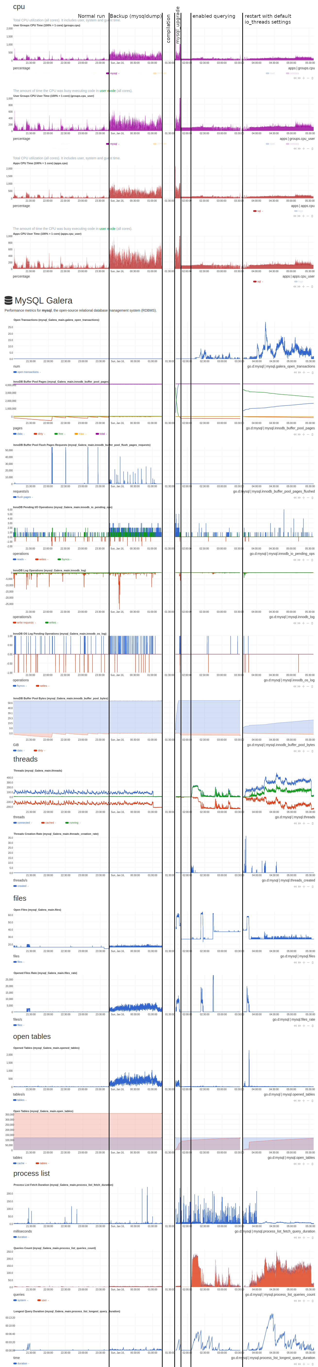 - Number of active queries in the processlist changed from 7-10 (with longest query time of 40 seconds) to 30-50 with longest query running about 900 seconds. Reason for the latest one was that queries timed out (increasing lock wait timeouts and session timeouts from 20 to 45 gave no positive effect), and rollback took ages due to being unable to gain a lock.