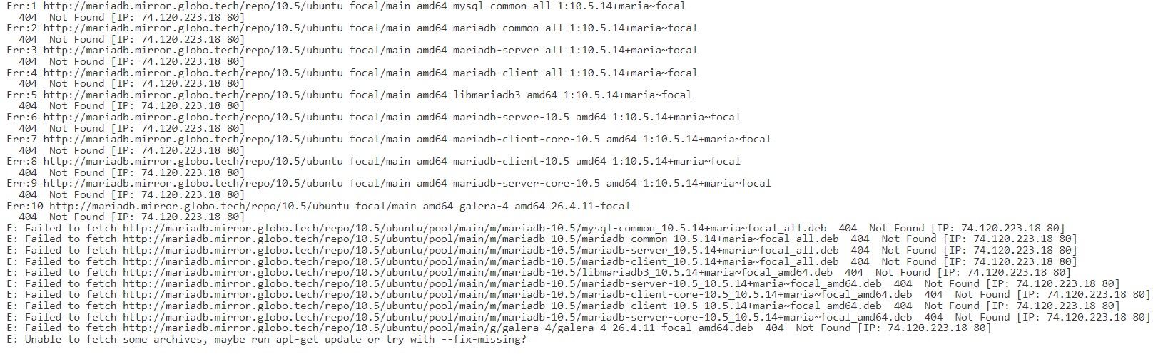 I'm trying to update the MariaDB installation on Ubuntu server 20.04, but it seems that the list of mirrors cannot be found or loaded.