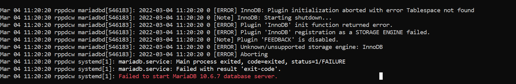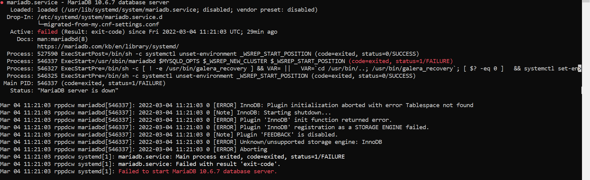 ● mariadb.service - MariaDB 10.6.7 database server Loaded: loaded (/usr/lib/systemd/system/mariadb.service; disabled; vendor preset: disabled) Drop-In: /etc/systemd/system/mariadb.service.d └─migrated-from-my.cnf-settings.conf Active: failed (Result: exit-code) since Fri 2022-03-04 11:21:03 UTC; 29min ago Docs: man:mariadbd(8) https://mariadb.com/kb/en/library/systemd/ Process: 527590 ExecStartPost=/bin/sh -c systemctl unset-environment _WSREP_START_POSITION (code=exited, status=0/SUCCESS) Process: 546337 ExecStart=/usr/sbin/mariadbd $MYSQLD_OPTS $_WSREP_NEW_CLUSTER $_WSREP_START_POSITION (code=exited, status=1/FAILURE) Process: 546327 ExecStartPre=/bin/sh -c [ ! -e /usr/bin/galera_recovery ] && VAR= || VAR=`cd /usr/bin/..; /usr/bin/galera_recovery`; [ $? -eq 0 ] && systemctl set-en> Process: 546325 ExecStartPre=/bin/sh -c systemctl unset-environment _WSREP_START_POSITION (code=exited, status=0/SUCCESS) Main PID: 546337 (code=exited, status=1/FAILURE) Status: "MariaDB server is down" Mar 04 11:21:03 rppdcw mariadbd[546337]: 2022-03-04 11:21:03 0 [ERROR] InnoDB: Plugin initialization aborted with error Tablespace not found Mar 04 11:21:03 rppdcw mariadbd[546337]: 2022-03-04 11:21:03 0 [Note] InnoDB: Starting shutdown... Mar 04 11:21:03 rppdcw mariadbd[546337]: 2022-03-04 11:21:03 0 [ERROR] Plugin 'InnoDB' init function returned error. Mar 04 11:21:03 rppdcw mariadbd[546337]: 2022-03-04 11:21:03 0 [ERROR] Plugin 'InnoDB' registration as a STORAGE ENGINE failed. Mar 04 11:21:03 rppdcw mariadbd[546337]: 2022-03-04 11:21:03 0 [Note] Plugin 'FEEDBACK' is disabled. Mar 04 11:21:03 rppdcw mariadbd[546337]: 2022-03-04 11:21:03 0 [ERROR] Unknown/unsupported storage engine: InnoDB Mar 04 11:21:03 rppdcw mariadbd[546337]: 2022-03-04 11:21:03 0 [ERROR] Aborting Mar 04 11:21:03 rppdcw systemd[1]: mariadb.service: Main process exited, code=exited, status=1/FAILURE Mar 04 11:21:03 rppdcw systemd[1]: mariadb.service: Failed with result 'exit-code'. Mar 04 11:21:03 rppdcw systemd[1]: Failed to start MariaDB 10.6.7 database server.