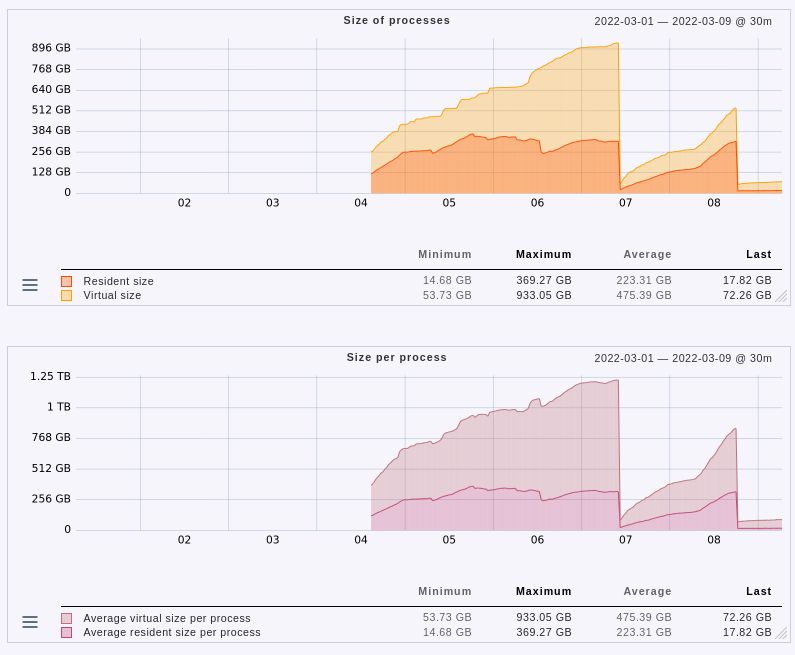 After an upgrade to this 10.3.32 with performance_schema=ON default probe enable we notice a change in the memory usage of the mariadb process. The Sum of global buffers & dynamic allocation is estimated 10G but we end up with a 350G RSS size in a day and stabilized to physical memory of the server until it OOM. Truncate all PS tables without being able to get back the used memory only restart with disabling PFS limit the process RSS to around 10G see attached monitoring and a 10s perf malloc of the workload