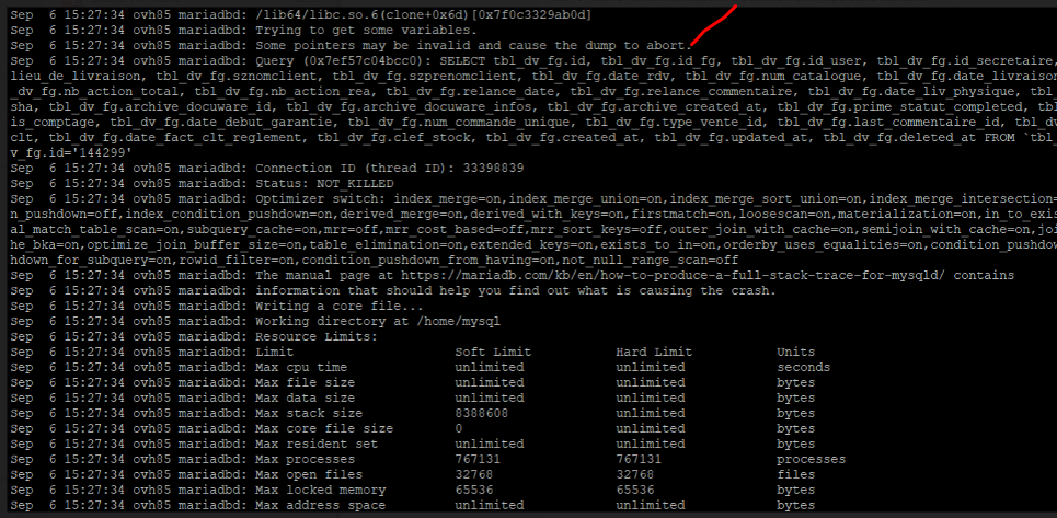 Sep  6 15:27:21 ovh85 mariadbd: where mysqld died. If you see no messages after this, something went