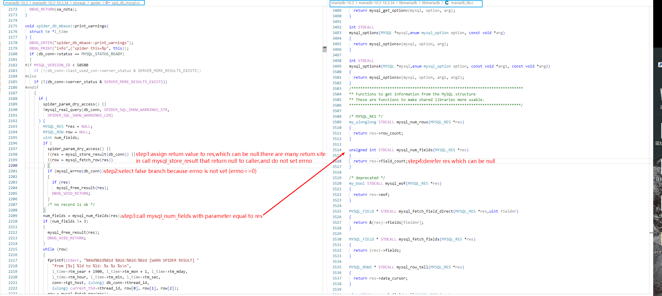 Hi, I found a potential null pointer dereference bug in the project source code, and I have shown the execution sequence of the program that may generate the bug on the graph below. The red text illustrates the steps that generate the bug, the red arrows represent the control flow,the file path can be seen in the blue framed section.