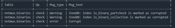Feb 09 20:30:54 SERVER_HOSTNAME mariadbd[3829372]: 2023-02-09 20:30:54 0 [ERROR] InnoDB: Flagged corruption of `INDEX_NAME` in table `DBNAME`.`TBLNAME` in purge