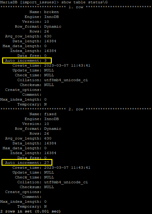 I imported sql dump from MySQL 5.5.62 to MariaDB. Imported file has about 2GB. Import was successful, but after MariaDB restart AUTO_INCREMENT values on some tables changed (for example: on table with max ID 11504 AUTO_INCREMENT changed from 11505 to 2).