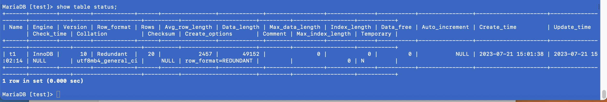 test.t1	optimize	note	Table does not support optimize, doing recreate + analyze instead