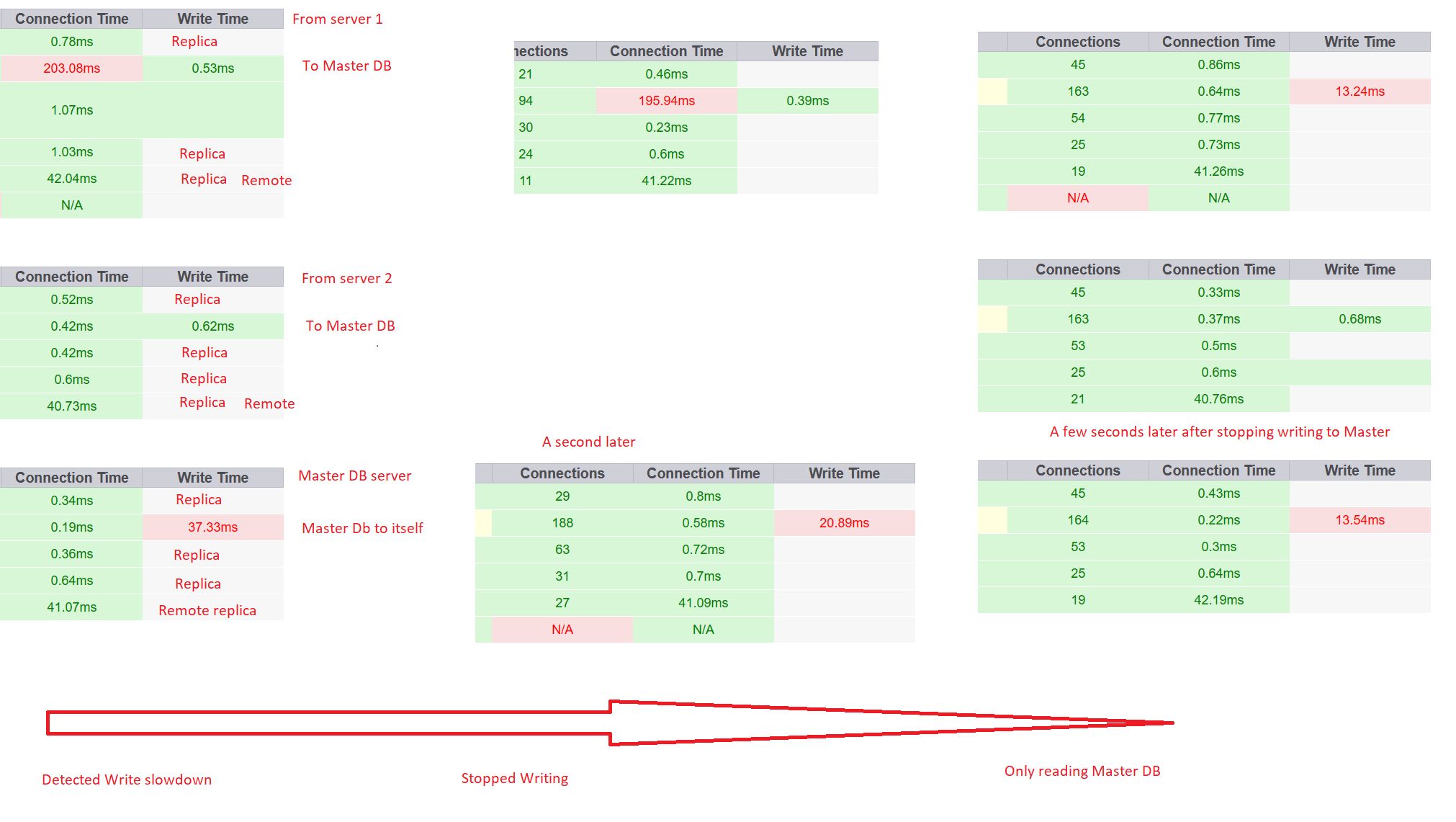 When this happens - a simple CONNECT to MariaDB is measured and it usually shows connection time of 60-460 ms instead of normal 0.5-1.1ms.