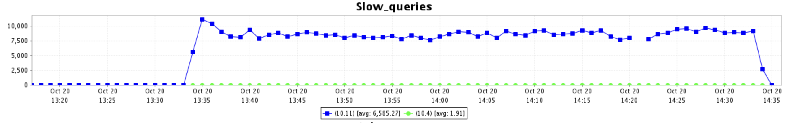 • We did see slow queries recorded in 10.11.4. slow_query config (long_query_time: 1 second)