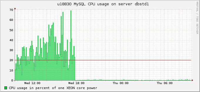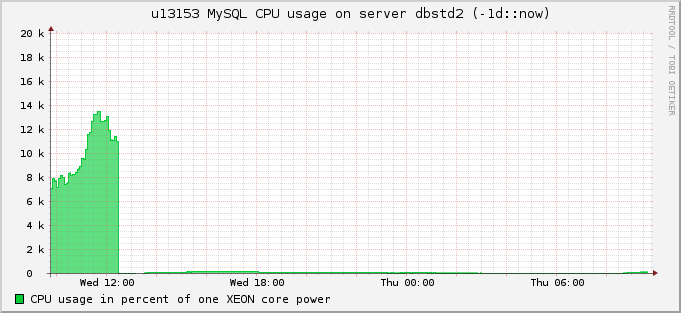 We collect user statistics and run "SELECT * FROM INFORMATION_SCHEMA.USER_STATISTICS; FLUSH USER_STATISTICS" every 5 minutes and then put received values to rrd databases. We noticed that after some uptime CPU_TIME counter goes mad and starts to show incredibly high usage values. After restarting MariaDB process it goes back to normal for some time. Please see attached graphs as examples. One can notice a huge drop down of CPU_TIME counter on both graphs. These are graphs for a random customer from two different MariaDB servers.