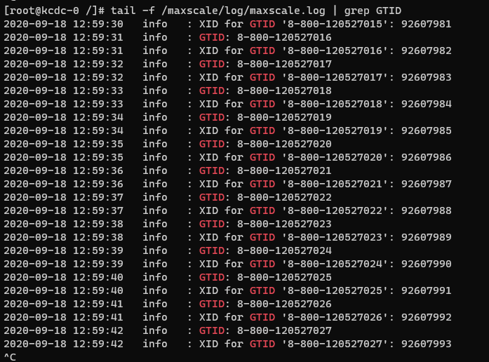 tail -f KafkaCDC log , found its GTID increased slowly,It lags far behind master's GTID