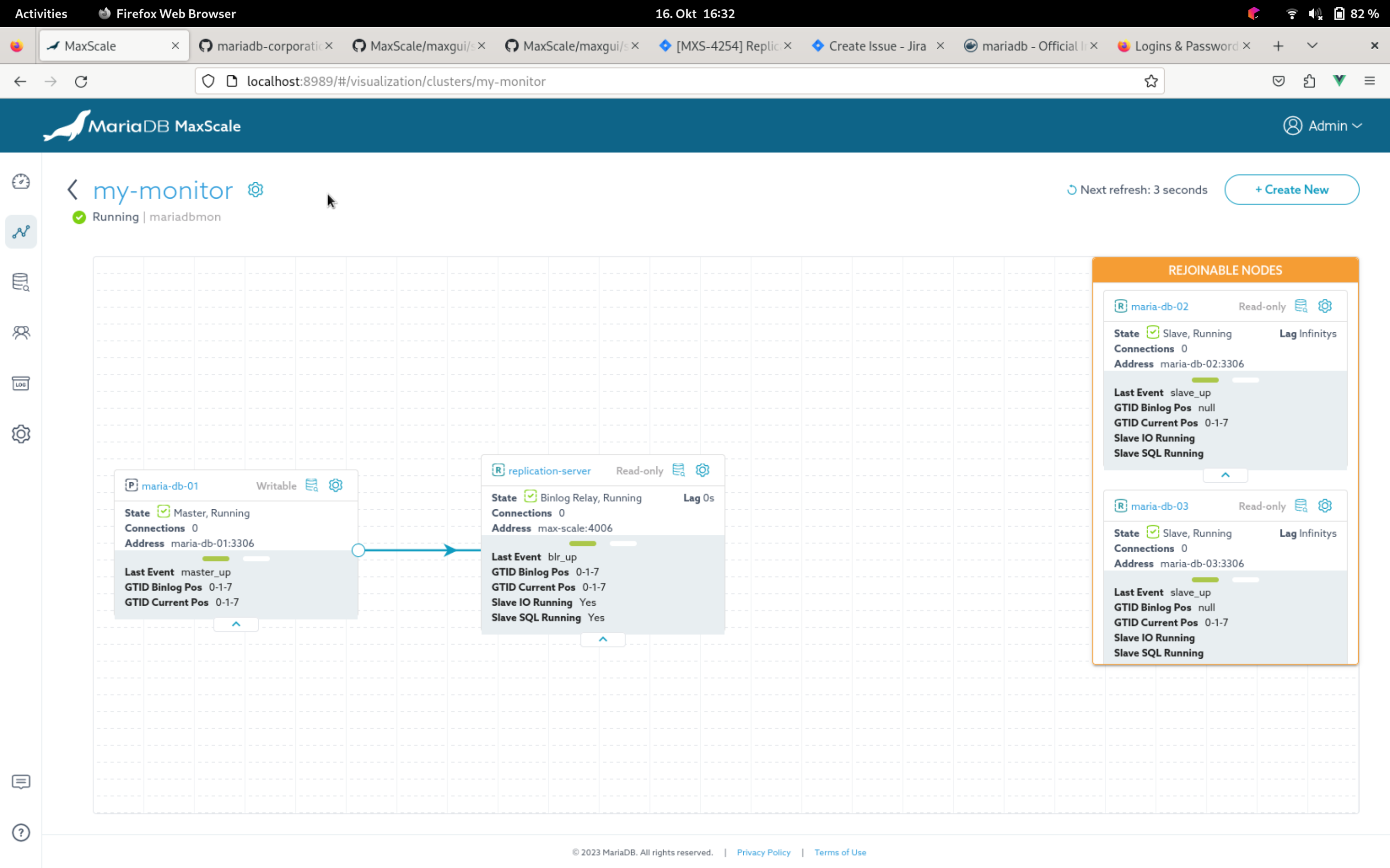 • Visualizing this setup via "Visualization" -> "Clusters" -> "my-monitor" shows maria-db-01 and replication-server correctly, and the replicas maria-db-02 and maria-db-03 are put in a box titled "rejoinable nodes". Both replicas are not connected to the replication-server instance.