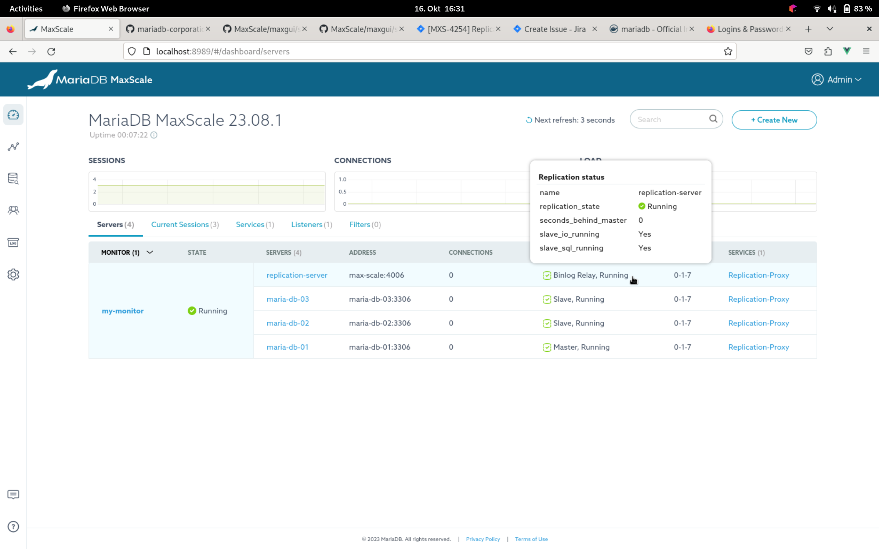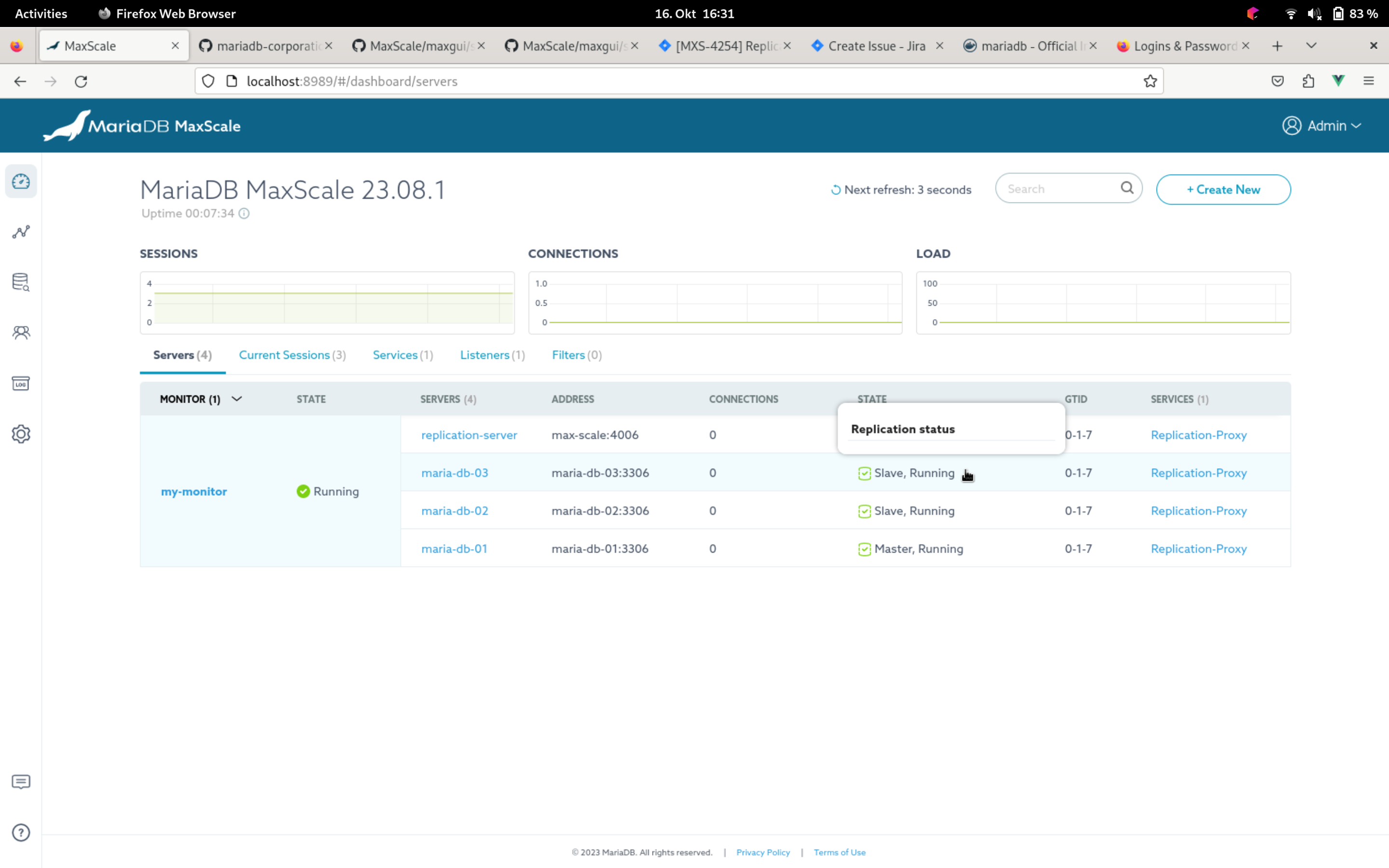 • The tooltip over maria-db-02 and maria-db-03 contains no properties at all (even though replication is healthy and running).