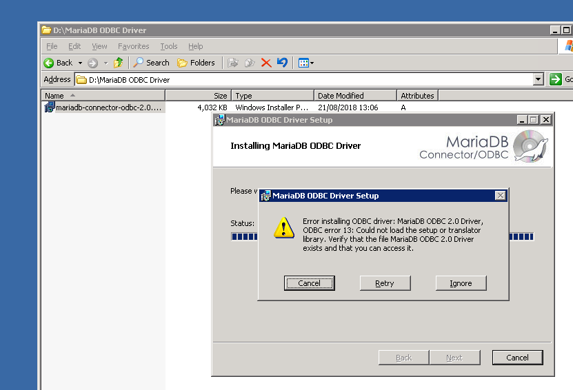 Get an error while trying to install MariaDB 2.0.17 on Windows 2003 server machine. Is there any other version of the odbc driver which is supported by the OS