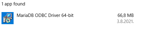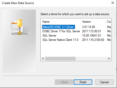 I have first created DSN with "ODBC Data Source (32/64 bit) " and installed from https://downloads.mariadb.org/connector-odbc/ MariaDB ODBC 3.13.