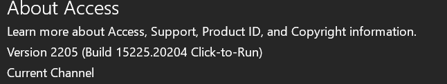 MariaDB back-end; MS Access front-end; Windows 10; Office version: version 2205 (Build 15225.20092)